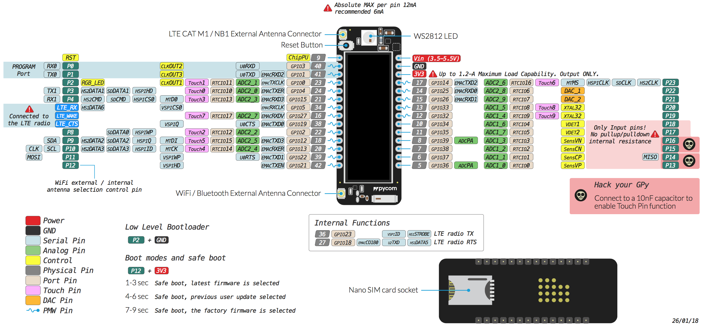Please note that the PIN assignments for UART1 (TX1/RX1), SPI (CLK, MOSI, MISO) and I2C (SDA, SCL) are defaults and can be changed via software.