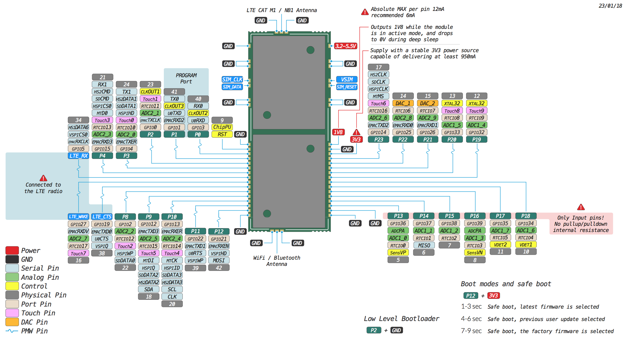 Please note that the PIN assignments for UART1 (TX1/RX1), SPI (CLK, MOSI, MISO) and I2C (SDA, SCL) are defaults and can be changed via software.