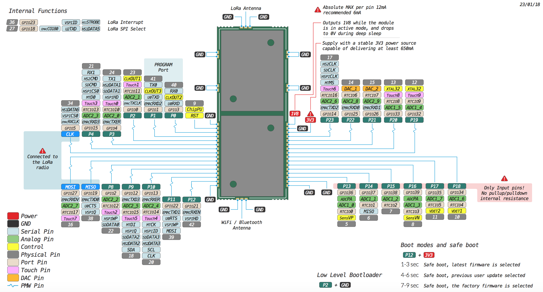 Please note that the PIN assignments for UART1 (TX1/RX1), SPI (CLK, MOSI, MISO) and I2C (SDA, SCL) are defaults and can be changed via software.