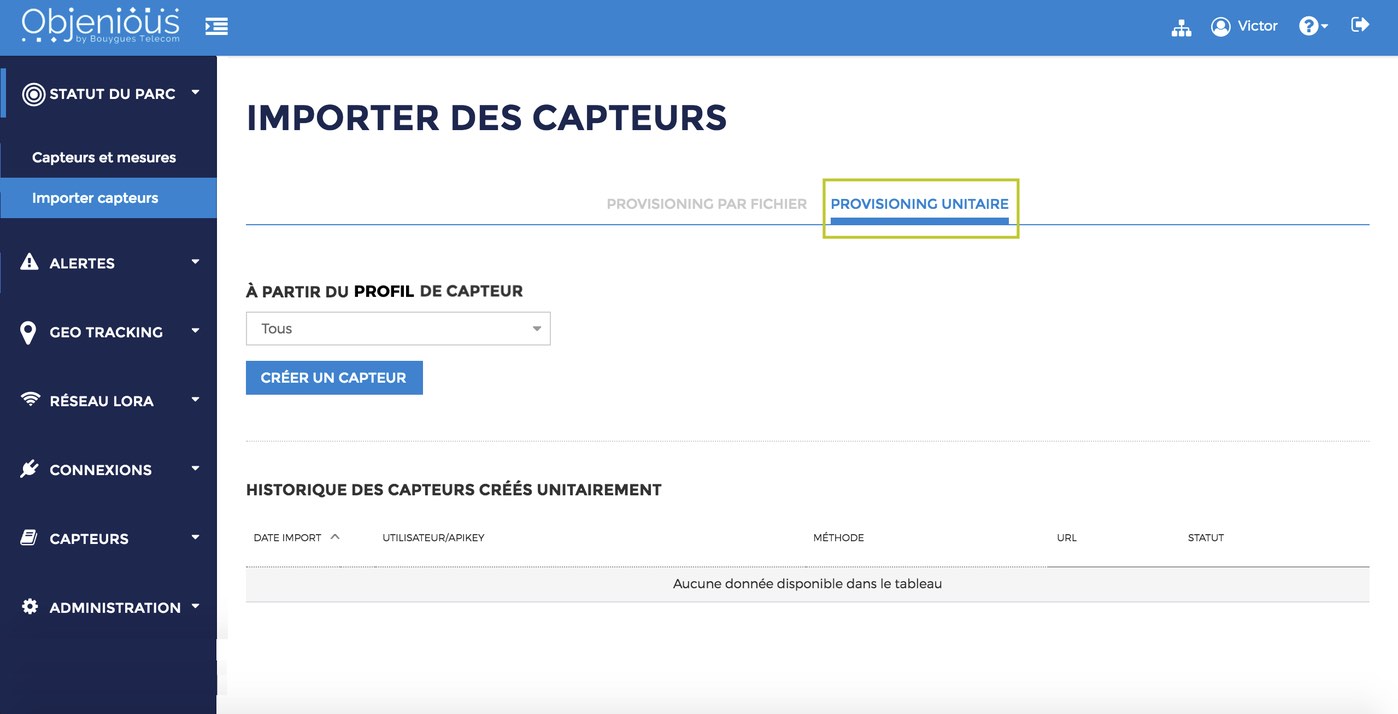Follow “Importer des capteurs” under “Statuc do Parc” and select “Provisioning Unitaire”: