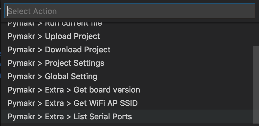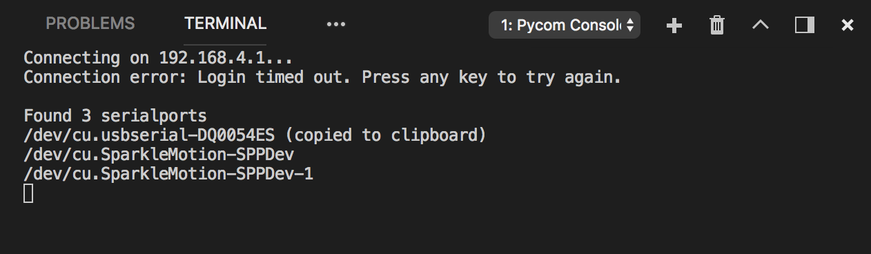 - This will list the available serial ports. If Pymakr is able to auto-detect which to use, this will be copied to your clipboard. If not please manually copy the correct serial port.