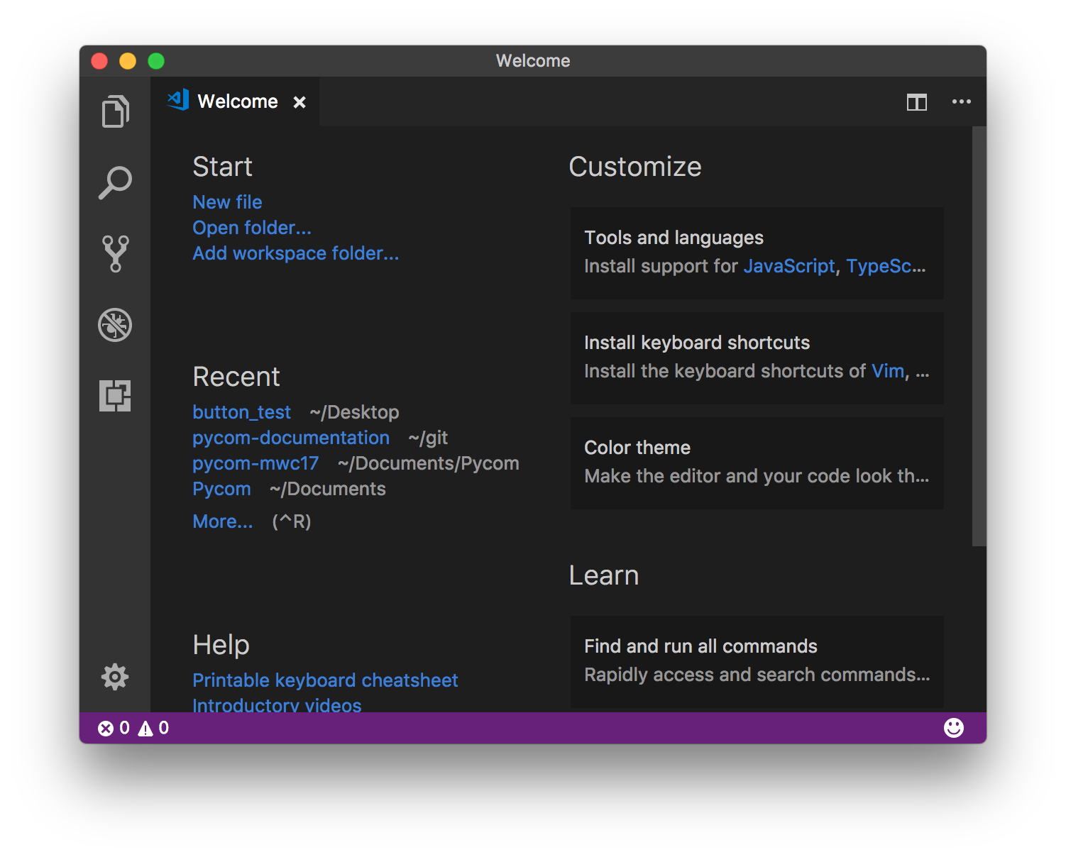 Pycom supports Microsoft’s Visual Studio Code IDE platform with the Pymakr Plugin.