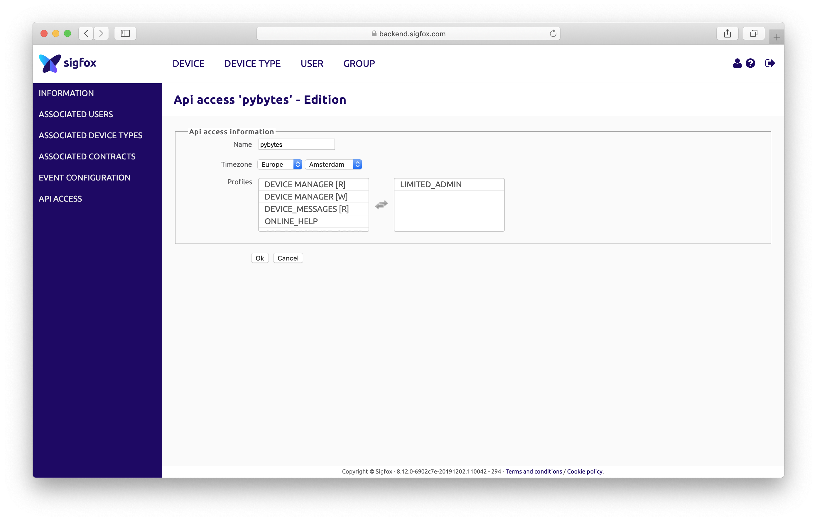 In the form chose a Name, e.g., pybytes. Then select the Profile LIMITED_ADMIN and click on Ok.