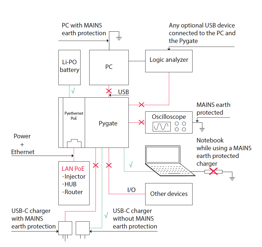 | USB-C cable connected to a PC with mains ground protection | NOT OK |